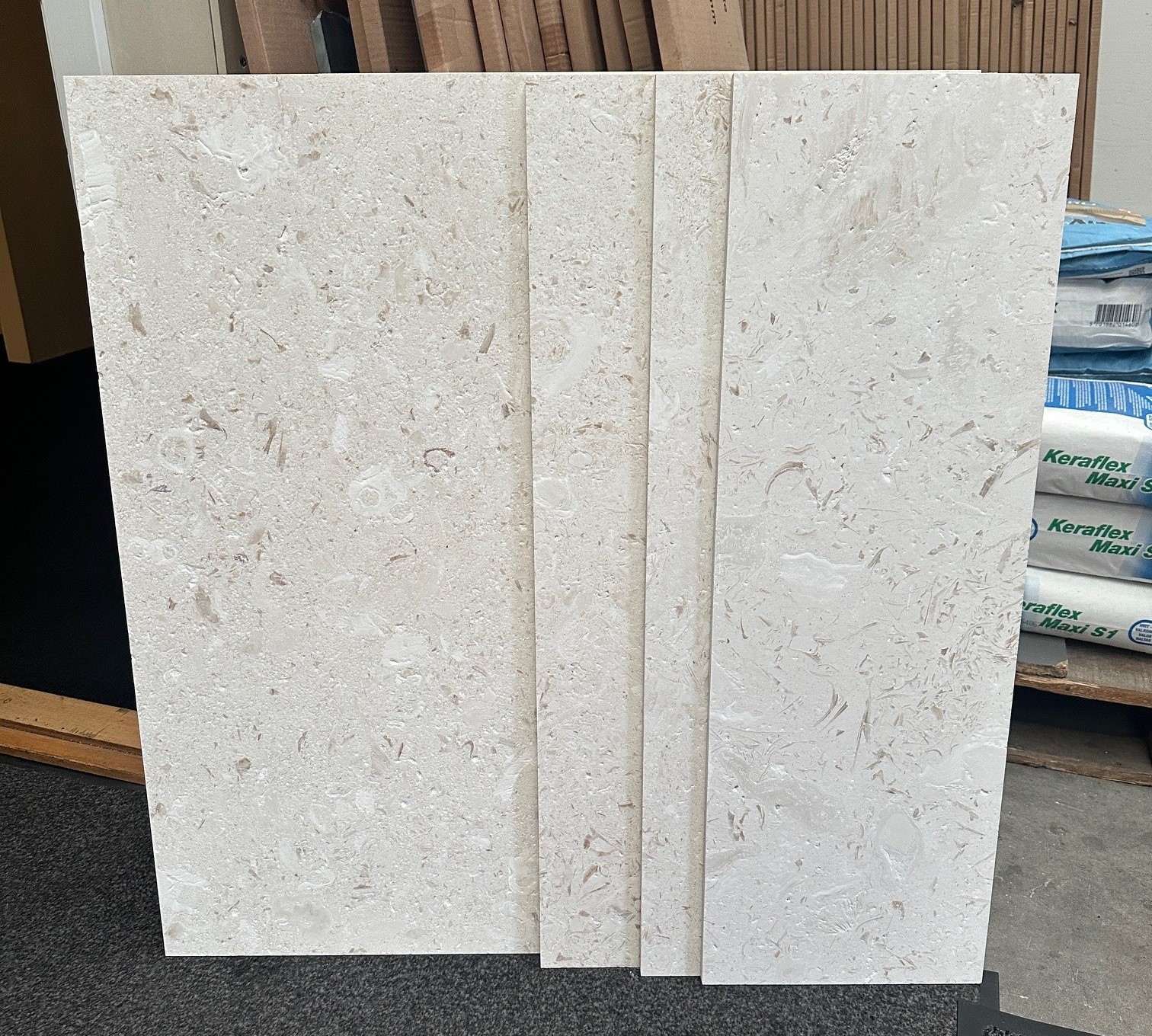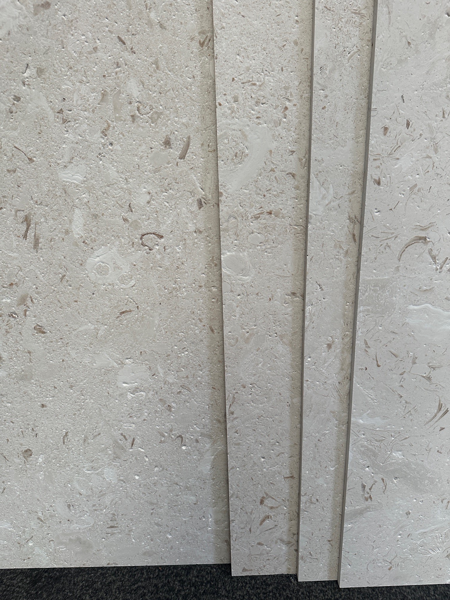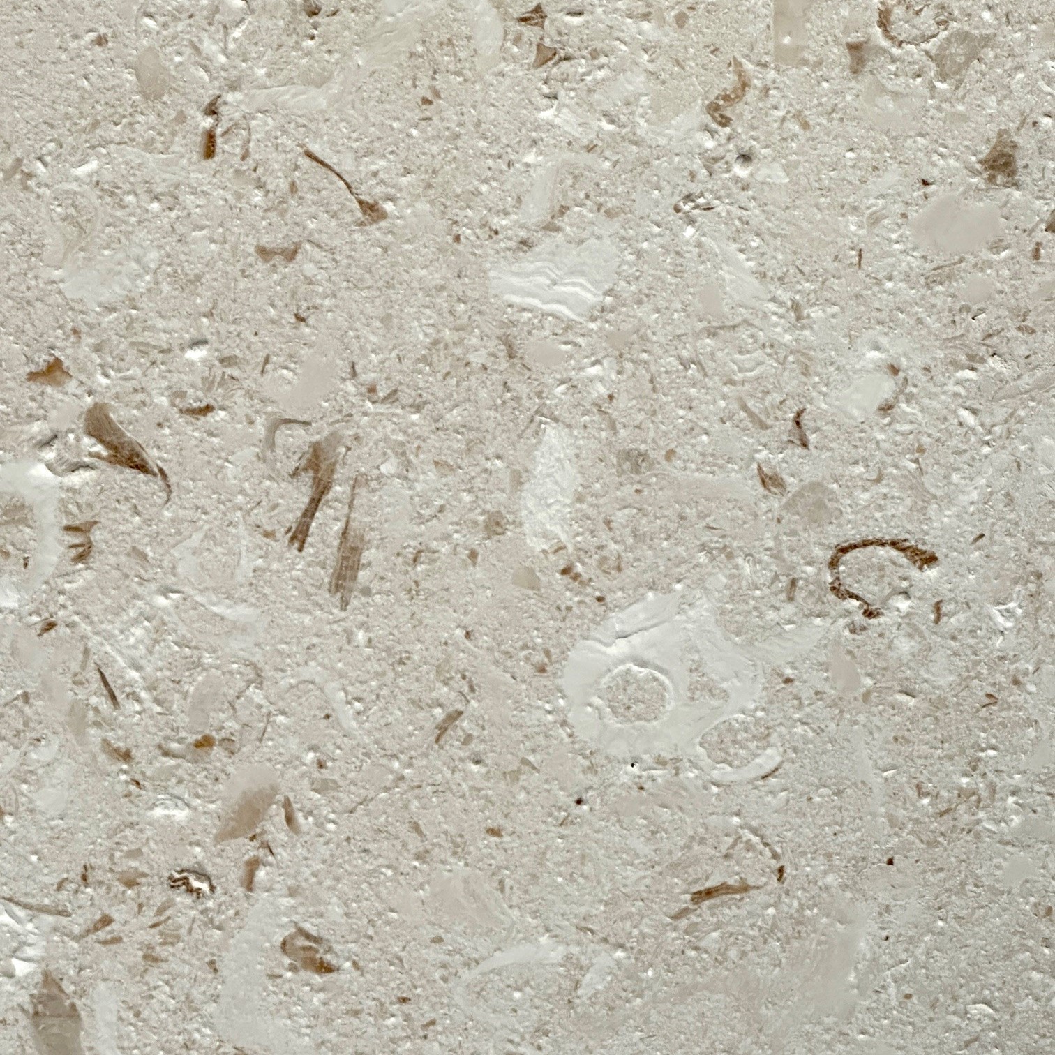 Her er den ultimative smukke kalksten. Farverne bevæger sig i sart beige/sand, med mørkere aftegninger af fossiler.