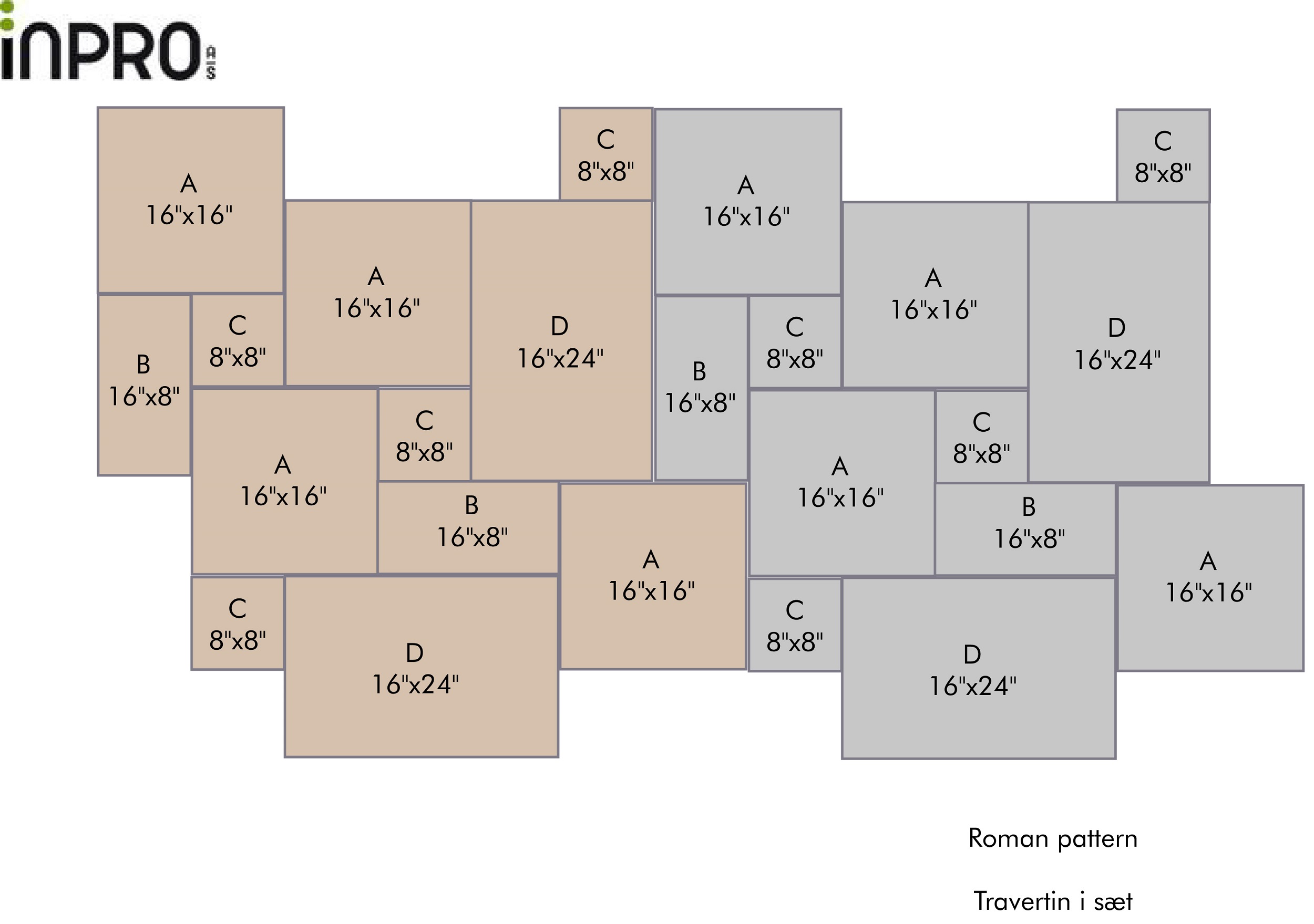 Denne travertin Classico er produceret i 4 størrelser, for at kunne monteres i det såkaldte romerske mønster. Se opbygningen af romersk sæt her >>>
